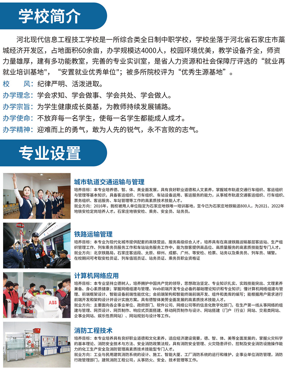 河北现代信息工程学校2025招生专业:城市轨道交通运输与管理专业、铁路运输管理专业、计算机网络应用专业、消防工程技术专业、护理专业、中药专业、口腔义齿制造专业、幼儿教育专业、美术绘画专业、运动训练专业、民族音乐与舞蹈专业等。