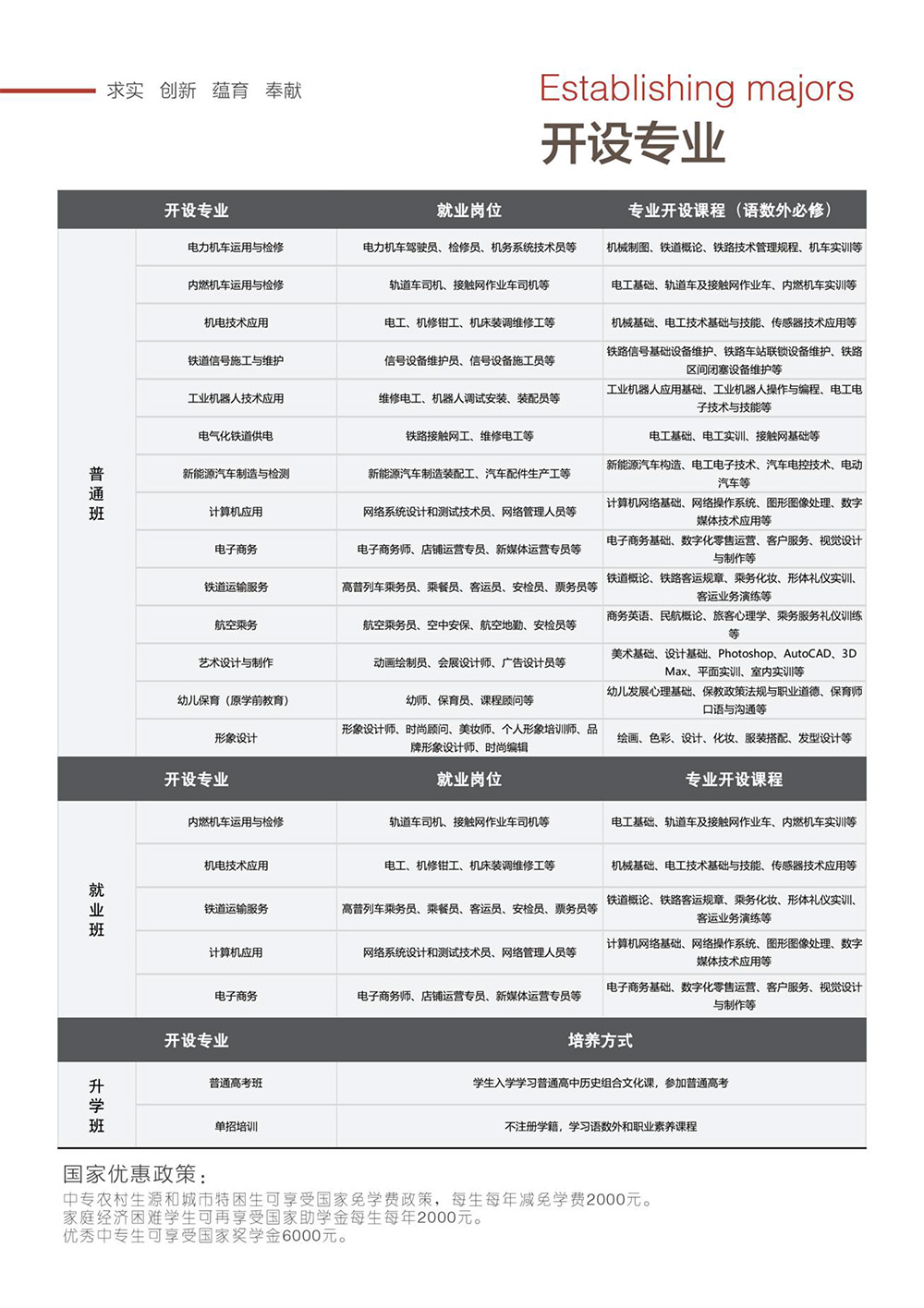现在校中专生8500多人,学校占地200多亩。同时拥有控股高等职业学校一所。历经28年发展已成为一所以铁路专业为主,集机械制造、能源电力、计算机、社会服务、艺术、财经等多种热门专业为一体的综合性院校,截至2022年底已为社会输送了近10万优秀专业技术人